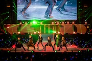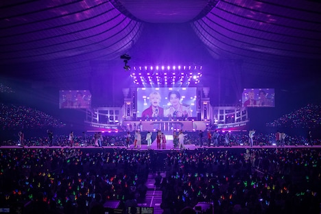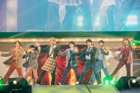 夜の大都会の光を浴びるSUPER★DRAGON、草原の中のさくらしめじ、虹色のステンドグラスを背にしたM!LK、ハイパースペースのような光の空間に包まれた超特急。開演時刻を迎えステージ上の巨大ビジョンに映し出されたのは、それぞれに異なる場所で静かに佇む9グループの姿だ。映像の中の彼らは、グループのメンバー1人が手にした羅針盤が放つ光の先をじっと見つめる。勢いよく進む9つの光が集まったその場所は、大海を進む1隻の豪華客船。代々木第一のメインステージ、豪華客船を模したセットが組まれた舞台上に勢ぞろいした総勢62人は一斉に敬礼し、この公演のために作られた新たな全体曲「What's up, Voyagers!」で、盛大に今年の「エビライ」の帆を上げた。