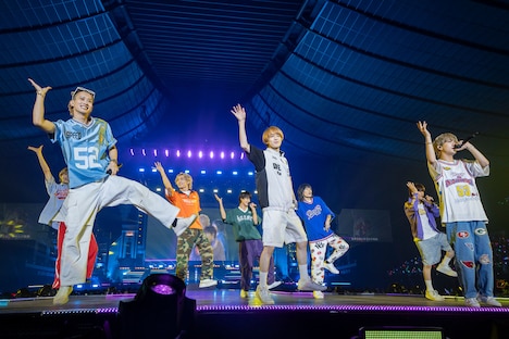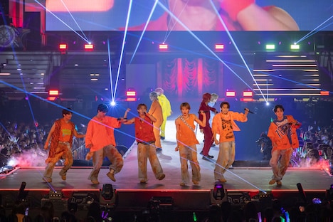 客船の船長や海軍を連想させるデコラティブな衣装は9組それぞれに異なる色やファブリックで仕立てられ、“甲板”の上にずらりと立ち並ぶEBiDANメンバーがエギュレットやマントを翻して歌い踊る壮観に、客席を埋め尽くすペンライトの光も1曲目から鮮やかに揺らめく。曲を終え、マイクを握った超特急のリョウガは、初日公演のテーマが「明るくハッピーなYELLOW ISLAND」であることを告げ、「ワクワクの冒険の旅に僕らと出かけましょう!」と観衆に呼びかけた。