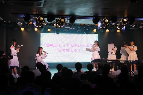 この日は定期公演に先立ち、昼に同会場でフリーライブも行われた。新生my favのステージをひと目見ようと多くのファンが集まる中、6人は疾走感あふれるナンバー「キミ僕」など5曲をパフォーマンスした。ライブ中盤には、質問に対して初期メンバー4人が川又か田中のどちらかを選ぶという趣旨のトーク企画「my fav 新メンバー2択」が行われた。「一緒に焼肉屋さんに行きたいのはどっち?」「家に遊びに行きたいのはどっち?」などの質問を受け、4人が「選べないよー!」と困惑する場面も。「プライベートのことを相談したいのはどっち?」という質問に対して西村瑠香が「適当じゃなく丁寧に、一生懸命考えてくれそう」と川又を選ぶと、田中は「えっ、私適当?」と苦笑い。また黒瀬梨花が「私は優柔不断だから。あんP(川又)は一緒に悩んでくれそうだけど、みほりん(田中)はアドバイスをくれそう」と田中を選んだところ、川又が「美帆ちゃんも優柔不断です!」と異議を唱えて会場が笑いに包まれた。