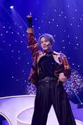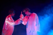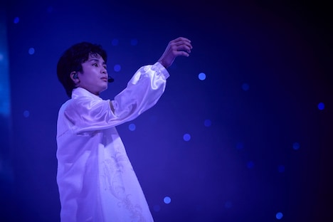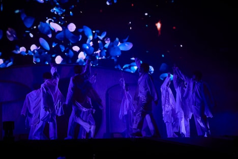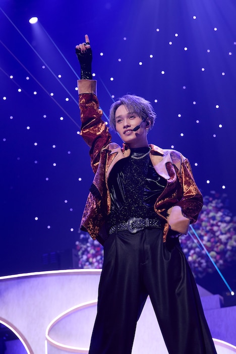 そんな「Beautiful Chaser」の衝撃を洗い流すような雨音が導いたバラードナンバーの「霖雨」ではボーカルのみがステージに立ち、深い喪失を歌い上げる。流れるような掛け合いを聞かせるタカシとシューヤの声には哀切が色濃くにじみ、静かに心を揺さぶる彼らの歌声に、オーディエンスはじっくりと聴き入った。そして「Thinking of You」へと進むとステージ奥のビジョンには月夜の草原が映し出され、9人は“月明かりの下”で穏やかに歌い踊る。タカシとシューヤの柔らかなファルセットボイスが響く中、1人たおやかに躍動したのはタクヤ。感情の機微を細やかな身振りで伝えるその舞いは祈りにも似て、9人が作り出す幻想的な世界観によって夜明けの草原には美しい花々が咲き誇った。“1粒の種”をメタファーに、命の神聖な輝きが描かれた4曲の物語は、ステージ上に1輪の花が咲くシーンをもって結ばれる。その赤い花を摘み取ったタクヤはそっと花を顔に寄せ、静かに目を閉じた。