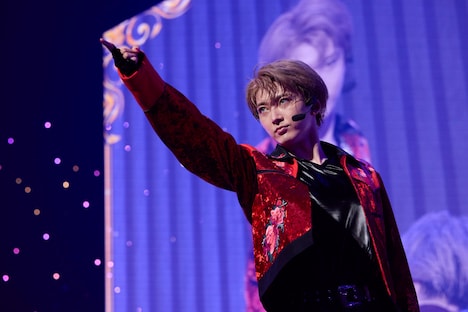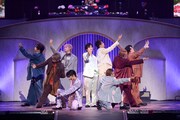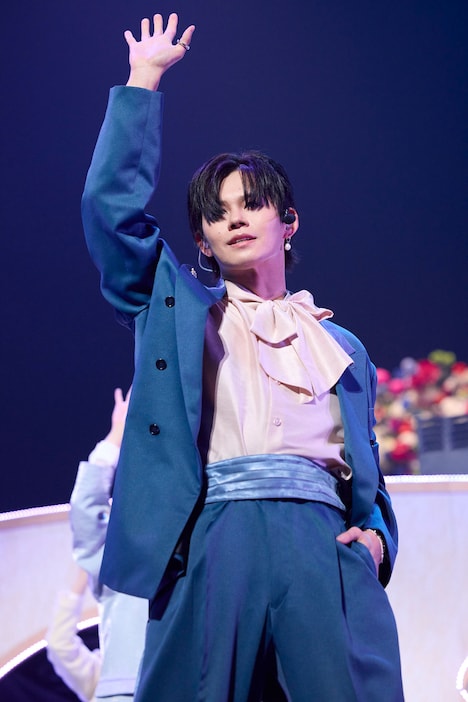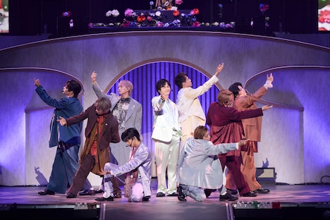超特急のワンマンライブではおなじみ、リーダー・リョウガによる開場中の影アナウンス。ハルとアロハにくすぐられながら諸注意を告げた彼の声に、客席の期待感はみるみる高まっていく。開演と同時にステージを覆っていた紗幕が落ち、ビジョンいっぱいに花が咲き誇るフラワーウォールが映し出されると、その奥からメンバーが姿を見せた。百花繚乱のフラワーオブジェの前でポーズを取る9人は、ドレスシャツとそれぞれのメンバーカラーを基調としたジャケットに身を包み、眼前に広がるペンライトの光の海を見つめる。そんな彼らの柔らかな笑みが2号車のカイから順にクローズアップされると、大きな歓声とともに光の海はキラキラと瞬いて輝きを増した。