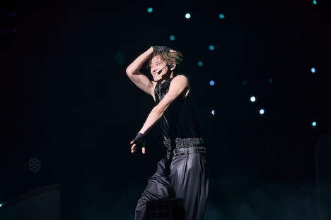 フィドルの音色が鮮やかにサウンドを彩る壮大なこの曲で9人は力強く大地を踏み鳴らし、荒々しくも美しく、生命力に満ちた歌とダンスを見せる。芯の通ったタカシの歌声、思い切りこぶしを利かせるシューヤのボーカルアレンジがトライバルなムードを加速させ、2人が最終盤に聴かせたパワフルなハモリとフェイクは会場に渦巻く熱を確かに引き上げた。すると今度は雷鳴が轟き、9人体制では今ツアーが初披露となった「Beautiful Chaser」へ。“美しき追跡者”という名が付いたこのハードロックナンバーでセンターのユーキが見せたのは、狂気に取りつかれたかのような迫真のパフォーマンス。光のない鋭い目つきで舞台上をさまよい、アロハを手にかけて“醒めない悪夢”を体現してゆく彼の姿、そして燃え盛る炎の演出の中で文字通りすべてを焼き尽くすような絶望を強烈に香らせてゆく9人の姿を、2万人は息を飲むように見つめた。