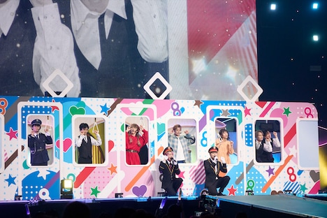 タカシの口上と同じく、こちらもいつの間にかツアー恒例となったユーキの一発ギャグコーナーへ。彼が「グーチョキパーで何作ろ~? 右手がグーで、左手もグーで、“My Buddy”~!」と、両頬をグーの手で潰す「My Buddy」の曲中ポーズを決め、メンバーからイヤモニを通して「かわいいに逃げてんじゃねえ」とツッコミを受けていると、メインステージに現れたのは車掌姿のシューヤ。「ここ、駅のホームですから。電車来るから!」と彼がユーキに注意喚起すると、学生に扮したリョウガ、タクヤ、マサヒロ、普段着姿のカイとアロハ、サラリーマン姿のハルが次々と“ホーム”に姿を見せた。カラフルな車両“Rail is Beautiful号”にメンバーが乗り込んだのを確認したもう1人の車掌・タカシは「乗車確認、OK。8号車の皆さんの笑顔、OK。それでは出発!」と進行の合図。満員電車の憂鬱をコミカルな歌とダンスで表現する「Rush Hour」を皮切りに、9人は電車から始まる、めくるめく“愛のミュージカル”の幕を開ける。