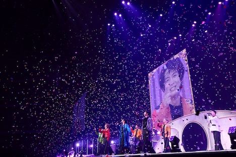 メンバーが次々にコール&レスポンスを先導して2万人の声を求め、「Call My Name」でライブはラストスパートへ。9色のジャケットを羽織ってカラフルに衣替えしたメンバーは横1列に大きく広がり、心踊るサウンドに体を揺らしながら「ドリーム半端ねえ!」と声を合わせる8号車の声を受け止めた。その後も「My Buddy」「Secret Express」と、8号車のダンスやコールが欠かせない楽曲たちをメドレー形式で畳みかけていく超特急。「Secret Express」でメンバーの振りに合わせ「ガッチャン!」と言う8号車の声がこだますると、ユーキは「今日イチの声聞かせてくれ、いくぞ!」とさらなるコールを求めて勢いを加速させる。センターのリョウガがヘッドバンギングを煽った「超えてアバンチュール」ののち、ムービーカメラを鷲づかみにして「お前ら盛り上がれ~!」と叫び、変顔を決めまくるタクヤの大暴れが狂騒を加速させた「SAY NO」では2桁号車の4人(シューヤ、マサヒロ、アロハ、ハル)がアリーナエリアの客席通路に飛び出して8号車のすぐ近くで声を求める。続く「Burn!」では1桁号車の5人(カイ、リョウガ、タクヤ、ユーキ、タカシ)も客席通路をダッシュ。そののちセンターステージで肩を組み合った9人は、声を合わせて落ちサビを全員で歌い上げた。