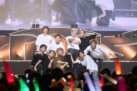ステージのあちこちから噴出する花火がパフォーマンスをダイナミックに彩った「Steal a Kiss」では、トップギアの攻撃力を持って8号車を挑発するアロハやタクヤ、ユーキの決めゼリフに会場が何度も沸き立つ。続く「MORA MORA」にはダンスブレイクのアレンジが差し込まれ、9人は一糸乱れぬパワフルな一挙一動でオーディエンスを圧倒。確かに高まっていく熱量に感情を昂らせたシューヤはマイクを逆手に力強いシャウトを響かせた。そして、マサヒロによるダンスソロが導いた「Body Rock」では、9脚のチェアを巧みに使った蠱惑的なダンスで8号車を魅了した9人。そんな彼らが見せる官能的な世界観は「We Can Do It!」で最高潮に。レーザー光線が忙しなく飛び交う中で1列に並んだメンバーは、お互いの体の線をなぞり、顔を寄せ合いながら客席を見遣る楽曲のハイライトで8号車を熱狂の渦へと巻き込んでいた。