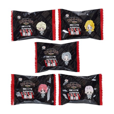 不二家が1984年から販売している「カントリーマアム」は、「外はサックリ、中はしっとり」が特徴のクッキー。「カントリーマアム 黒服ココア味(ココア味)」はLUNA SEAの結成35周年記念ツアー「ERA TO ERA」の開催を記念して発売されるもので、箱のパッケージだけでなく、メンバーイラストが描かれた個包装も目を引く一品となっている。パッケージには全6種類のうち3種類のオリジナルミニカードも付属する。