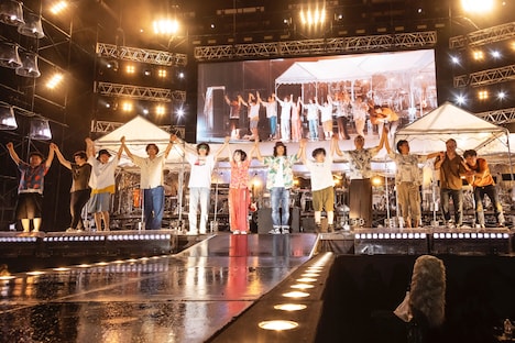 その後も雨はやむことなく、aikoとオーディエンスの頭上に容赦なく降り続ける。このロケーションにぴったりの曲「よるのうみ」が歌われた頃には、雨脚はより一層強くなり、雨粒を弾くレインコートの音が裏寂しく鳴り続けた。それでもaikoはライブの勢いを一切落とさず、水をしたたらせながら「アップルパイ」「skirt」「愛の病」を連続で披露。「もうこんな雨の中で歌えることもないと思って前向きに歌ってるんですけど、皆さん大丈夫ですか?」と労わりの言葉をかけつつ、観客が掲げるスマホのライトに包まれながら「カブトムシ」のワンフレーズを即興で歌唱した。人気曲「キラキラ」を経て披露されたのは、「雨よ止んで お願い」という歌詞をリフレインする「夏が帰る」。まるで会場にいる全員の祈りそのもののようなこのフレーズが歌われるたび、実際に雨脚が弱くなっていくという奇跡的な展開が。ラストの「雨よ 止んで 止んで お願い」のロングトーンが響き渡る頃には、会場には雨上がり特有のさわやかな空気が充満していた。