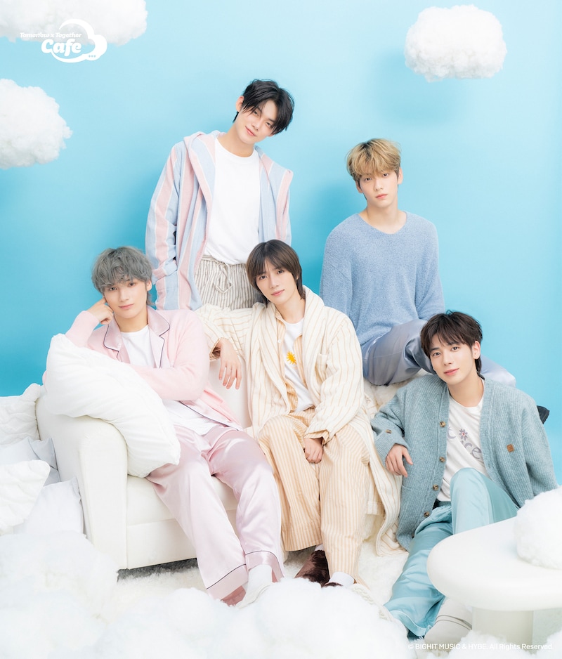 デザートは「SOOBIN ドーナツパフェ」「YEONJUN チョコミントパンケーキ」「BEOMGYU クッキー&ティラミス」「TAEHYUN いちごみるくのアサイーボウル」「HUENINGKAI アイスパフェ」といったメンバーの名前を冠したラインナップ。それぞれを注文した人には各メンバーのメッセージカードがプレゼントされる。ドリンクは「もこもこ雲ソーダ」「青空のゼリードリンク」「空色のホットバタフライピーティー」という青色のスペシャルメニューのほか、コーヒーやティー、コーラ、ジンジャエール、オレンジジュースといったセットドリンクも販売され、ドリンクメニューを注文した人にはオリジナル紙コースターが配布される。