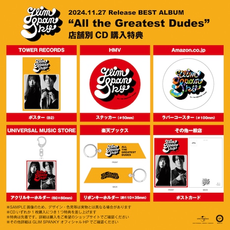 また「All the Greatest Dudes」の各店舗別特典のデザインも公開。タワーレコードではポスター、HMV&BOOKSではステッカー、Amazon.co.jpではラバーコースター、UNIVERSAL MUSIC STOREではアクリルキーホルダー、楽天ブックスではリボンキーホルダー、その他のショップではポストカードが配布される。