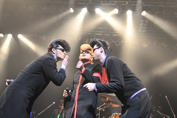 さわおが先ほどのMCで「もしかして俺たちのこと好きなんじゃないのかな?」と発言したことを受けて、綾小路翔(Vo)は「好きに決まってんだろ!」と絶叫。「どんだけ好きか見せてやろうぜー?」と言って早乙女光(Dance & Scream)と西園寺瞳(G)を呼び、3人で「KOOL SPICE」「Please Mr. Lostman」のアルバムジャケットものまねを披露した。また続く「鉄のハート」の演奏では弦楽器メンバー3人も前に出て横1列になって観客を煽り、お祭り騒ぎのパフォーマンスでthe pillowsファンのハートもがっちりキャッチした。