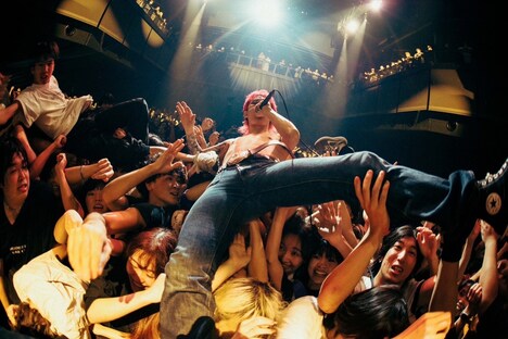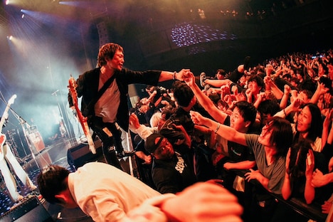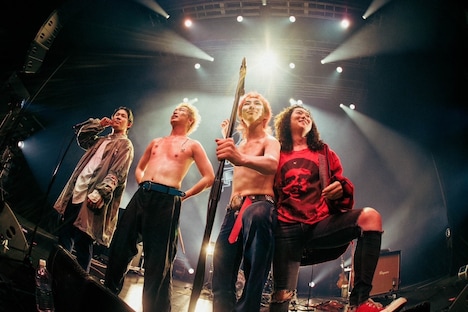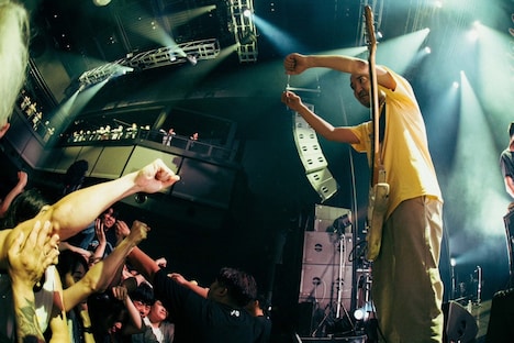 トップバッターを務めたのはTHE FOREVER YOUNG。彼らはハルカミライの「星世界航行曲」を無骨なロックサウンドでカバーしてオーディエンスを沸かせた。またエバヤンの演奏中には、クニタケヒロキ(Vo, B)が客席に突っ込んだかと思えば、ハルカミライの小松謙太(Dr, Cho)や関大地(G, Cho)もステージに乱入してフロアにダイブし、Zepp Shinjukuをカオティックなムードで満たした。MCでクニタケは「FOUR FISTS」の歴史を振り返りつつ、「さみしいっちゃけど、一緒にデッカい思い出作りにきたけん」と明るい口調で語る。そして「WORLD END」では彼が「上がってきたいやつは上がってこいよ!」と煽り、次々にステージに上がってくるオーディエンスと熱いハグを交わす。彼らは場内をピースフルなムードで満たして次のアクトにバトンを託した。