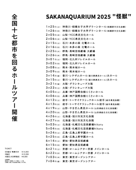 そして今回、その新曲のタイトルを掲げた全国ホールツアー「SAKANAQUARIUM 2025 “怪獣”」の開催が決定。サカナクションのホールツアーは、2020年に開催された「SAKANAQUARIUM 2020 “834.194 光”」が新型コロナウイルス感染拡大を受けて途中で中止になり、2022年に開催を予定されていた「SAKANAQUARIUM アダプト NAKED」は、山口一郎の休養のため全公演中止となったため、今回の「SAKANAQUARIUM 2025 “怪獣”」が、約5年ぶりの待望の全国ホールツアーとなる。