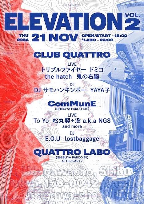 パルコが主催するサーキットイベント「ELEVATION vol.2」が11月21日に東京・渋谷CLUB QUATTRO、ComMunE、QUATTRO LABOの3会場で開催される。