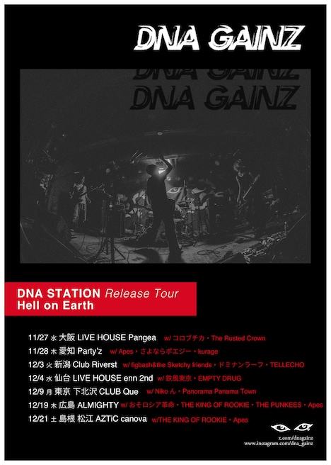 DNA GAINZは11月27日より全国ツアー「Hell on Earth」を開催。EP詳細と併せて、各公演のゲストバンドも発表された。チケットはイープラスで販売中。