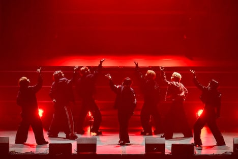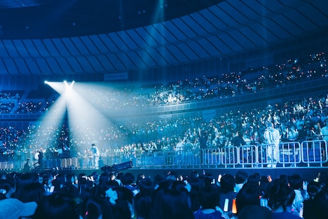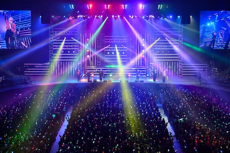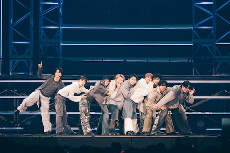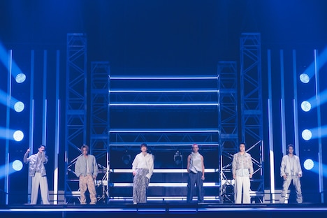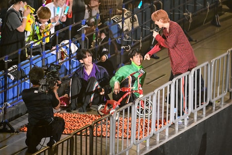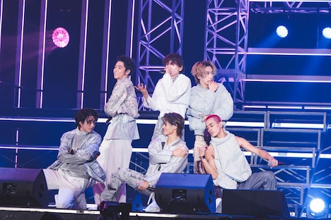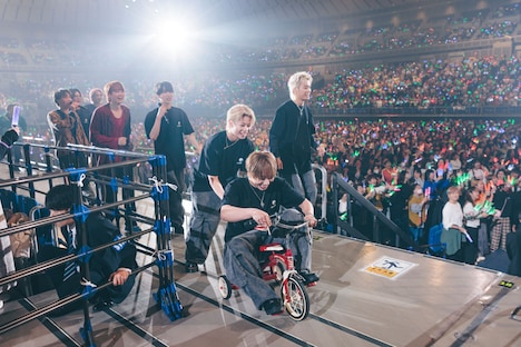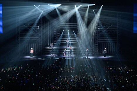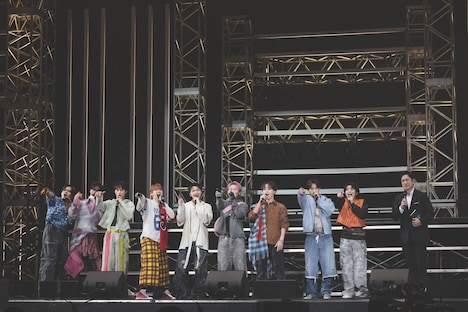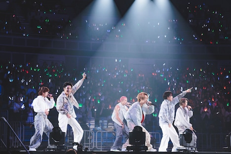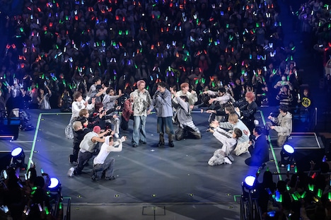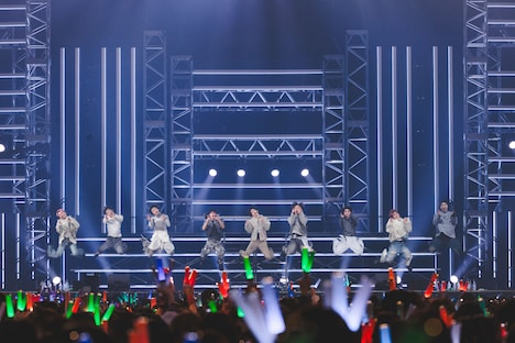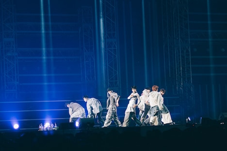 またこの日のライブでは、2日後にリリースが控える新曲「AwA AwA」のパフォーマンスがライブ初披露された。「見よう見まねで一緒に踊って楽しんでいただけたら」というメンバーの呼びかけののち、シューヤの「はあ~あ」というため息から始まったこの曲で、9人はコミカルでにぎやかなパフォーマンスを見せる。両手で2つの“泡”を形作り、その“泡”をしなやかに揺らめかせるダンスは初披露から間もない状況だったにもかかわらず、8号車を筆頭にした客席は9人の動きを即座にコピー。カラフルなペンライトの光がリズムに合わせてゆらゆらと舞う、美しい一体感を形成する。この光景を目の前にしたメンバーの表情も晴れやかに弾け、横浜アリーナは心地よい高揚感で満たされていった。