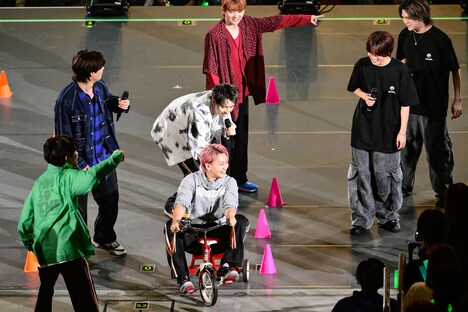 MAZZELとWATWING、それぞれが魅力を発揮したライブコーナーを経て、イベントはいよいよ“VS.企画”へ。「超特急 VS MAZZEL」は「三輪車リレー対決」が行われた。超特急とMAZZEL、それぞれスポーツウェアに着替えて再登場すると、カイ(超特急)は「三輪車、普段使ってるので」と余裕の表情でMAZZELを牽制。アリーナの外周1周をメンバー全員でリレーするこのバトルにおいて、超特急はMAZZELよりもメンバーが2人多いことに言及し「“数の暴力”でいきます!」と意気込む。するとMAZZELも「この日に向けて三輪車いっぱい乗ってきたじゃん!?」とお互いを鼓舞。両者円陣を組んだのち、カイとRANを第1走者に三輪車リレーの号砲が鳴った。