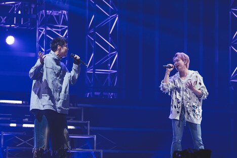 3曲を終え、ここで改めて自己紹介を行った9人。ここまでの和やかな“戦い”を、リョウガは「ゲームコーナーとか、かなり殺伐としていましたが……」と振り返り「今だけは“一時休戦”と言いますか。皆さん8号車として“乗車”していただければと思っております」とMUZE、Windyに語りかける。するとカイも「今日ここ、横浜アリーナを世界で一番熱いステージにしていきましょう!」と続け、彼らの呼びかけに会場中のペンライトの光が瞬いた。そして9人はダークな世界観で魅了する「Spice」でライブを再開させる。スリリングなボーカルのかけあいの中、ダンサー陣はダイナミックなステップとニュアンスで魅せるムーブの緩急が効いた群舞でオーディエンスをぐっと惹き付けた。イントロのメロディで8号車の歓声が上がったのは「Before Dawn」。1番をボーカルのみで届ける構成で披露されたこの曲では、9人が卓越した表現力を見せて超特急の真価を発揮。“夜明け前の2人”の情景を鮮やかに浮き上がらせる情感豊かな舞いと艶やかなボーカルワークの融合を、オーディエンスは息を呑むように見つめていた。