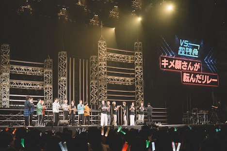 いざ勝負がスタートすると、超特急メンバーもWATWINGメンバーも全力でお題の表情をアピール。「イケメン」に始まり、「変顔」「満面の笑み」……と、メンバーたちの表情がカメラに抜かれるたび、8号車もWindy(WATWINGファンの呼称)もノリよく歓声を上げ、リレーは終始大盛り上がりの中進んでゆく。中でも「ぶりっこさんが転んだ」でハルが見せたあざとい表情には、客席中から「かわいい~!」の声が。そんな中、WATWING走者の鈴木曉は「“くりこさん”って誰ですか?」とキョトン顔を浮かべ、今度は笑いで注目をさらう。表情を変幻自在に操りながら歌い踊るライブパフォーマンスを得意としている超特急メンバーの“匠の技”はもちろん、底抜けに明るくサービス精神旺盛なWATWINGメンバーの振り切れた表情も見どころとなったこのバトル。終盤に差し掛かると両チーム勝負そっちのけとなり、いつの間にか参加者全員でキメ顔をしながらゴールテープを目指すカオスな展開に。しまいには両者共に息を合わせて芸術点の高いフォーメーションを織り成すことに力を注いでしまったため、リレーでは決着がつかず「一発芸をして面白いほうが勝ち」というルールが壇上で決められる。アンカーのタカシと八村による一発ギャグ対決は、八村の“自爆”によってタカシに軍配。この一連の流れにユーキは涙を流して大笑いし、その泣き顔で客席中の笑顔を増幅させていた。