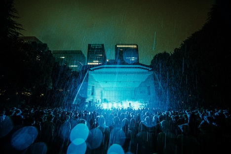 この日は夕刻に近付くにつれて雨脚が強くなり、開演時間の17:30には地面を打ち付けるように大粒の雨が空から降り注いでいた。日の入りもすっかり早くなり、3つのライトに照らされて無人のステージだけが闇の中に浮かび上がる。会場に集った観客は雨粒の向こうにあるステージを期待の眼差しでじっと見つめ、その時を今か今かと待ち望んだ。