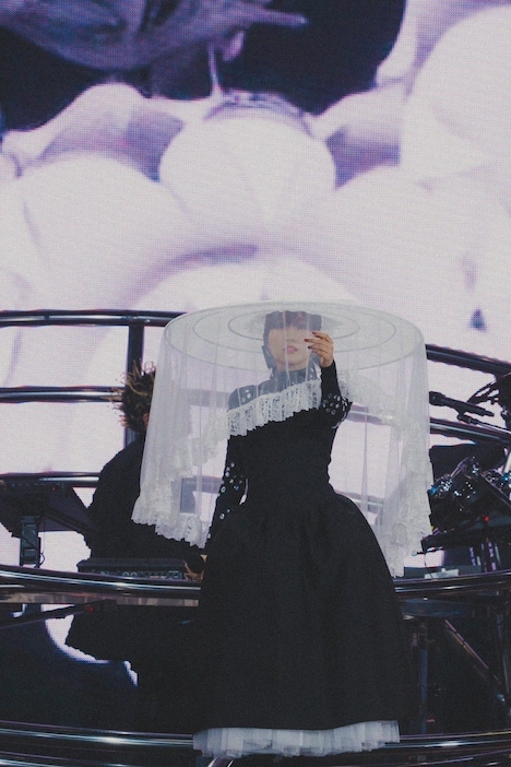 バンドメンバーと同様にブラックのスーツスタイルに着替えたAyaseもステージにそろうと、ikuraがクラシカルな雰囲気のブラックドレスにベール付きのつば広ハットをかぶって奈落からせり上がって登場。荘厳な雰囲気の中でYOASOBIは「勇者」を届け、会場を圧倒する。その後、一筋のスポットライトに照らされたikuraはアカペラで「あの夢をなぞって」のワンフレーズを歌唱。ステージが明るく照らされると、ステージにはオリジナルバンドメンバーの仄雲、山本、ミソハギ、AssHに、現在YOASOBIバンドに参加しているAmano Tatsuya(Dr /