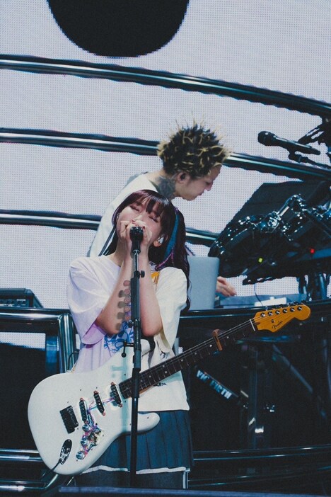 「ハルカ」を歌ったあと、YOASOBIは冷蔵庫の中からグループに関するクイズが書かれたカードを取り出し、突然のクイズタイムを展開。ここではikuraが長年ジェットコースターのことを「ゼットコースター」だと勘違いしていたことや、Ayaseが自由に鳥肌を立たせるという1000人に1人しかいない特技を持つことが明かされた。そしてYOASOBIの原点とも言える部屋のセットのステージで、本日11月11日にリリースしたばかりの新曲「New me」をパフォーマンス。フレッシュなステージを披露したYOASOBIの2人が一度退場すると、メインステージでブラックのスーツをまとった仄雲(Dr)、やまもとひかる(B)、ミソハギザクロ(Key)、AssH(G)というバンドメンバーが改めて紹介された。