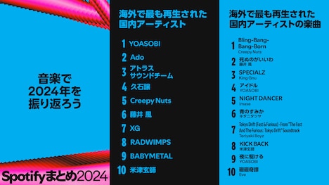 2024年の「日本で最も再生された楽曲」、そして「海外で最も再生された国内アーティストの楽曲」は
