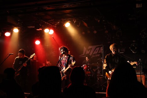 ステージの幕が上がると、Large House Satisfactionは「CM」で重々しいサウンドをたっぷりと轟かせていく。小林要司(Vo, G)はシャウトにも似た声で「Bang Bang Bang」を歌い上げ、ど派手なギターソロを炸裂させた。彼のギターリフでスタートしたのは「Traffic」。激しいパフォーマンスを見せた要司が「もうわかってると思うけど、全然怖くないバンドです」と口にすると、フロアから「怖いよー!」という声が上がり、会場が笑いに包まれる。彼が「juJoe、呼んでくれてどうもありがとうございます。juJoeも、いつまでやるんだろうね。僕たちももう20年やってますから。バンドに呪われてしまいました。誰の益にもならないことを、俺たちのためだけにやってます」と話すと、小林賢司(B, Cho)は「そんなことない! みんなのためだよ!」とすかさずフォローした。