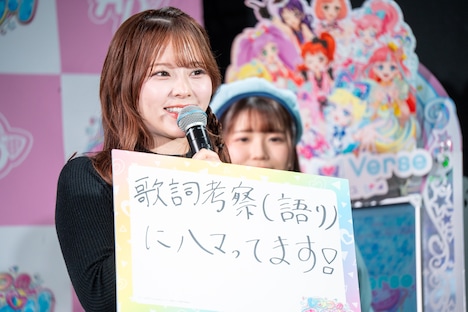 さらに、アニメだけでなくゲームや玩具などさまざまな「アイプリ」関連の発表が行われる中、菅田は齊藤とともに「今日のニュースに負けないくらいの個人的なニュース」をフリップで報告。「歌詞考察(語り)にハマってます!」と発表した齊藤は「私、とき宣さんの曲が大好きで! めっちゃ聴いてます!」と切り出すと、「一番好きなのは『わがままプリンセス』で、最近は『ときどきセンチメンタル』と『こんなあたしはいかがですか』と『最上級にかわいいの!』も大好きです!」と具体的な曲名を挙げて熱弁し、超とき宣メンバーを喜ばせる。齊藤が「とき宣さんの歌詞は、『私を愛してくれなきゃやだ!』みたいな歌詞がかわいくて。『ときどきセンチメンタル』も『逃したプリンセスは大きいの!』という歌詞が好きで、本当にプリンセスな皆さんがそれを歌っているのがかわいらしくて大好きです」と言葉を続けると、坂井は「とき宣の歌は愛が重ためな歌が多いので、そこを好きって言っていただけてうれしいです」と表情をほころばせた。また、菅田は「車の学校に入学しました」と車の免許を取得するために自動車教習所に入所したことを笑顔で報告した。