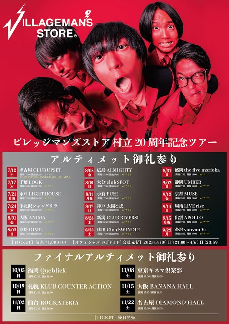 6月にはベストアルバムの発売を記念したインストアイベントが全国5カ所で開催される。さらに7月から11月にかけてアルバムの発売に伴う全国ツアー「ビレッジマンズストア 村立20周年記念ツアー」が実施される。このツアーは「アルティメット御礼参り」と「ファイナルアルティメット御礼参り」の2つの開催スケジュールに分けて行われ、対バン17公演、ワンマン7公演からなる。オフィシャルファンクラブでは4月6日23:59まで「アルティメット御礼参り」のチケットの先行予約を受付中。