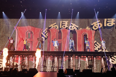 ツアーの演出を手がけたのはメンバーの藤井流星。クールな表情から一変するコミカルな展開でライブの振り幅を早くも感じさせるオープニング映像に続き、「A.H.O. -Audio Hang Out-」の収録曲が次々と披露されていった。本作にはメンバー7人がそれぞれの好みを生かして制作に携わった7曲が収録されているが、今回のツアーではこの7曲すべてを披露。重岡大毅が作詞作曲を手がけた「それいけベストフレンド!」では振付も重岡自身が担当。濱田崇裕が携わった「Rainy Rhapsody」、桐山照史が携わった「ティダ」は中盤のアコースティックコーナーで披露され、メンバー7人は楽器の演奏でもオーディエンスを魅了した。