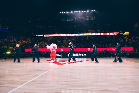 ダンサーを従えてコートに登場した佐藤を、千葉ジェッツのマスコットキャラクター・ジャンボくんが「景」「瑚」と書かれた2枚のうちわを掲げて歓迎。佐藤は「皆さん盛り上がっていきましょう!」と述べ、自身が作詞作曲に参加したソロ楽曲「BANANA」をパフォーマンスした。