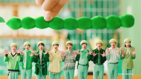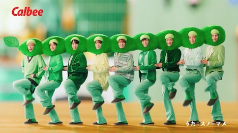 「miino」は2017年に発売された、豆まるごとのおいしさを楽しめる商品。新CMでは緑色のベレー帽を被ったSnow Manが大きな1つのサヤでつながった“スノーマメ”となって、「そら豆そのままカルビーミーノ!」「ウマくてびっくり! しちゃうらしーの!」「嘘だと思ったら食べてほしーの」と歌う。