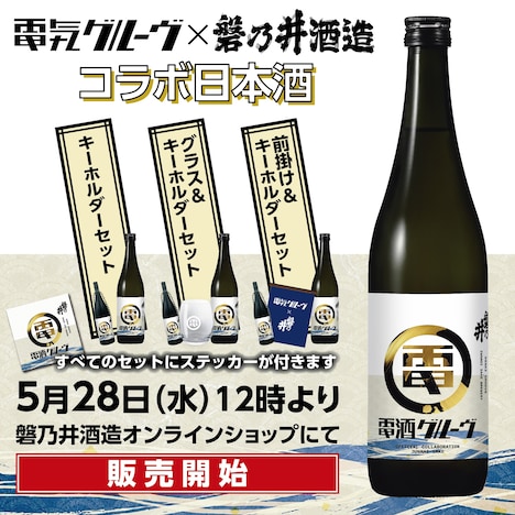 磐乃井酒造のオンラインショップでは明日5月28日12:00より「電酒グルーヴ」の「前掛け&キーホルダーセット」「グラス&キーホルダーセット」「キーホルダーセット」を数量限定で発売。すべてのセットに日本酒のラベル絵柄のステッカーが付属する。商品は6月9日以降に順次発送予定。