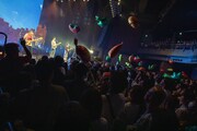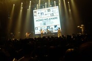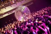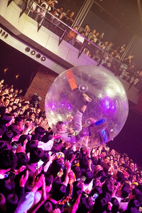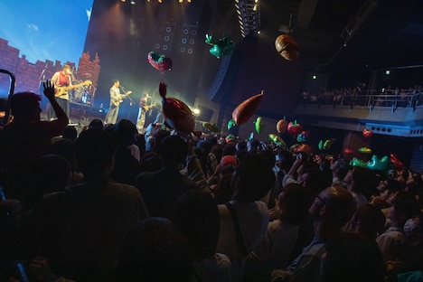 リアルタイム映像が投影された「東京」のあとには、玉置が姿をくらます。そのまま「かむかもしかもにどもかも!」の演奏が始まり、歌声の発信源を探して観客が周囲を見回していると、サブステージからウォーターボールに入った彼が再登場しフロアにダイブ。早口言葉を繰り出しながら観客の上を転がり、場内を盛大に沸かせた。ステージに戻り、“透明の玉”を脱いだ玉置は息を整えながら「すべてが皆さんのおかげです。本当に支えてくださってありがとうございます!」とダブルミーニングで感謝の思いを伝えた。そしてライブ終盤、「風の向きが変わって」でエモーショナルな空気を広げたMONO NO AWARE。温かな旋律の「88」では加藤が大人3人に担がれながら情緒あふれるギターを轟かせた。見どころ満載のライブは「そこにあったから」でフィナーレへ。ぐねぐね踊るチューブマンとカラフルな紙吹雪がステージを華やかに彩った。