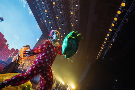 迫力のあるコーラスワークの「野菜もどうぞ」では、ピエロが野菜型の風船をステージからフロアへこれでもかというほど投下。「野菜は美味しいから食う」と玉置が歌う頃には、フロアには大量の風船がせわしなく跳ねる珍しい光景が広がった。夕焼けのようなライトがメンバーを照らした「アングル」の次に配されたのは「同釜」。熱狂を誘う長尺アレンジのアウトロで、1人のピエロがステージ背後のセットをぶち破るセンセーショナルな逃避行を繰り広げた。このように凝った演出とダイナミックな演奏、MONO NO AWAREらしい遊び心が融合したステージが展開され、「次はいったい何が起こるのか?」と絶え間なく観客の胸を高鳴らせた。