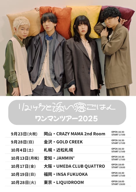 ワンマンツアーは9月23日の岡山・CRAZYMAMA 2nd Roomを皮切りに、10月28日の東京・LIQUIDROOMまで全国7都市で開催される。リュックと添い寝ごはんがワンマンツアーを開催するのは約1年半ぶり。チケットのファンクラブ先行予約受付は、本日22:00から6月29日23:59まで行われる。