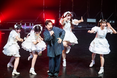 ステージにはバンドセットが設置されており、そこに現れたfoot vinegarと春日山が挨拶代わりに強烈なビートを鳴らす。先攻は礼賛だ。CLR=サーヤは「どうもー! 勝ち組オタクでーす!」と誇らしげにステージへ。さかのぼること11年前、学生だったサーヤは第1期の清 竜人25がデビューシングル「Will♡You♡Marry♡Me?」をリリースした際に行ったリリースイベントに足を運び、大興奮でライブを楽しんでいた。生粋の清 竜人25ファンであるサーヤは、アーティストとしてステージ上で競演できる喜びを爆発させ、フロアの観客も“同志”として熱い声援を送った。