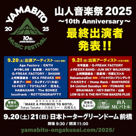 9月20日と21日に群馬・日本トーターグリーンドーム前橋にて行われるライブイベント「山人音楽祭 2025」の追加出演アーティストが発表された。