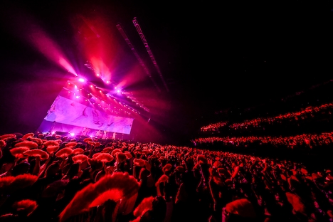 インストで披露された「BL」ではメロディラインをひばりくんのギターが奏で、いつもとは異なる音像で観客を魅了する。そんな中でアヴちゃんは「強火」のアーティスト写真と同じ、真紅と白の衣装にチェンジして再登場。代わってメンバー4人がステージを降りたあとは、アヴちゃんがシンフォニックなアレンジの音源に乗せて「MYSTERIOUS」を優美に歌い上げ、場内をロマンチックな空気へと変えた。