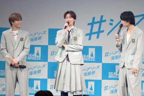 シーブリーズのボトルを手に挨拶した4人は、グループ活動においてもシーブリーズが欠かせない存在であることをファンに伝え、吉田は「リリースイベントだったりライブの楽屋には必ず置いてあって、みんなで使ってます」と明かした。司会者に「一番“滝アセ”なのは?」と問われると、曽野は「じんちゃん(吉田)じゃない?」と即答。すると山中が「最近追い上げてるのがだいちゃん(塩崎)」と付け加え、塩崎は「筋トレを始めて、ジムに通い出したら代謝がよくなって。なので(シーブリーズを)けっこう使ってます!」とコメントした。