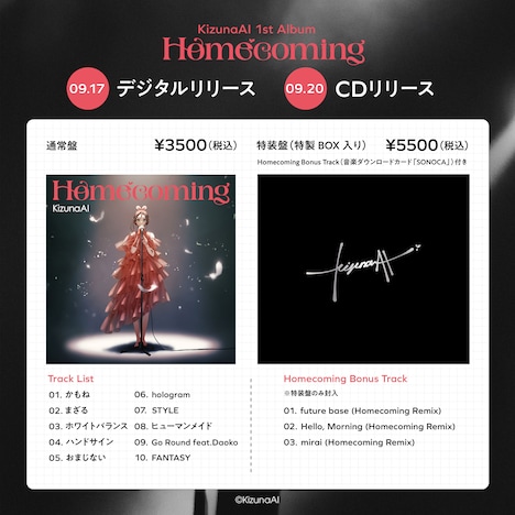 本日9月10日にアルバムより「おまじない」の先行配信がスタート。illiomoteとAvec Avecが制作したこの曲は、日常の何気ない会話の延長のような内容の軽快なポップソングとなっている。YouTubeではミュージックビデオが公開された。また「KizunaAI Comeback Concert "Homecoming"」の会場および公式グッズストアではアルバムのCD版が数量限定で販売される。