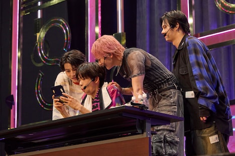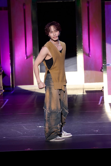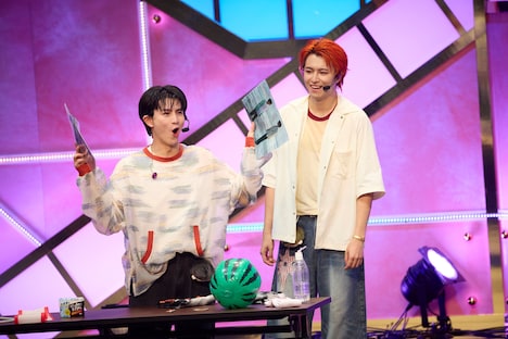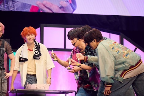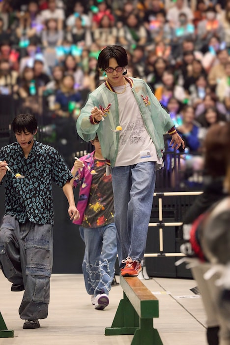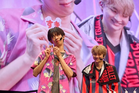 2つのゲームの得点を集計した結果、優勝に輝いたのはいずれのバトルでも強さを発揮したBチーム。そして最下位は2位と10ポイント差でCチームに決まり、カイは「敗因はハッキリしてますね。じゃんけんが弱い!」と悔しそうに声を上げた。Cチームには罰ゲームとして「全力一発ギャグ」が課せられ、3人はハル、カイ、リョウガの順で一発ギャグを披露することに。果敢に先陣を切ったハルは「ピタゴラスイッチ」の歌をハミングし、ピタゴラ装置の動きを体で再現しながら最後の「ピタゴラスイッチ♪」で変顔を繰り出すというギャグを見せた。すると、続くカイは「お前だけには傷を負わせねえ!」と勇ましく8号車の前に踊り出るも「けんけんぱ、けんけんパソコン!」とデスクワークのポーズを決めるギャグで会場の空気を凍らせてしまう。「これはヤバい。死んだぞ……」とメンバーがざわつく中、ラストのリョウガはハルのギャグを踏襲し、最後の「ピタゴラスイッチ♪」でダブルピースを決めるというユルいオチでメンバーから総ツッコミを食らっていた。