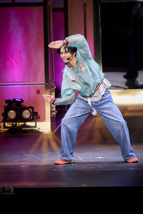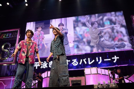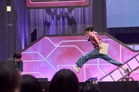 10日夜公演の企画コーナーは、Aチームにカイ、タカシ、ハル、Bチームにタクヤ、ユーキ、シューヤ、Cチームにリョウガ、マサヒロ、アロハという組分けで実施された。最初のゲームは「指差し確認! 遠距離ジェスチャー」で、9人は客席通路に設置されたお立ち台からステージ上のチームメイトに向けてジェスチャーをし、正解数の多さを競うというチャレンジに挑む。制限時間が3分間と短いため、ジェスチャー役の交代にもスピードが求められるこのゲーム。“チーム陽キャ”と命名されたCチームが一番手を担うと、アロハは持ち前の表情の豊かさとキレのある動きを駆使して「ステーキを食べるペンギン」や「髭剃りをするマイケル・ジャクソン」といったお題を的確に伝えていく。続くマサヒロも「テニスをするロボット」でテクニカルなロボットダンスを見せるなど、ダンサー魂を感じさせるジェスチャーを披露。アンカーを担ったリョウガもまた「シャボン玉をするサル」で巧みなパントマイムを見せ、3人は12問正解でチャレンジを終えた。