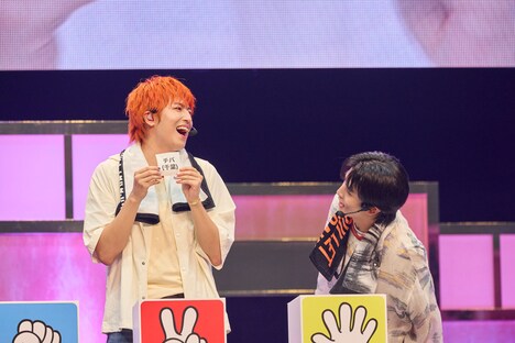 喉の調子が万全でないユーキのためにタカシが用意してくれたという特製ドリンクを回し飲みしたタクヤとハルによる“まずい”表情のリアクションリレーに、チーム分けくじ引きでのボケ合戦……と、脱力感満点のアイドリングタイムを挟み、10日昼公演の企画コーナーはAチームにユーキ、マサヒロ、アロハ、Bチームにタクヤ、タカシ、シューヤ、Cチームにカイ、リョウガ、ハルという組分けで実施された。1つ目のゲームは「グリコじゃんけん」をアレンジした「8号車の中を駆け抜けろ! ジャンケンワード」。各チームの3人はじゃんけんする人、“ジャンケンワード”のくじを引く人、“ジャンケンワード”の歩数で進むプレイヤー役を順番に担いながら、ステージと客席通路をつないだコースを1周するレースに臨んだ。超特急のじゃんけんと言えば「最初はStar☆」のかけ声で星をかたどる、通称“星野じゃんけん”がおなじみのスタイルとなっているが、9人はこの日も“星野じゃんけん”の型を崩すことなくゲームを進行。すると、Bチームでじゃんけん役のトップバッターを担ったタクヤがマサヒロ、カイを相手に4連続で勝利するという無類の勝負強さを発揮し、プレイヤー役・シューヤの駒を大幅に進める。一方で5回戦を終えてもなおスタート地点に留まっていたのはCチームのリョウガ。6回戦、7回戦でようやくカイが勝利し、くじ引き役のハルが「中華そば」「パンケーキ」を引くと、リョウガは「リョウガ足長いから2文字でシューヤに追い付く!」とチームメイトが期待を寄せる中で大きなストライドを見せ、計11歩でステージ中央から客席通路まで降りるというファインプレーでレースを盛り上げた。