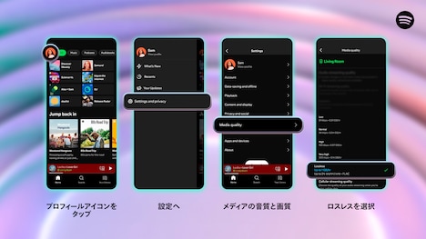 Spotifyでは、Wi-Fi、モバイル通信、ダウンロードそれぞれに設定をカスタマイズ可能で、音質は「低」「標準」「高」「最高音質」に加え、新たに「ロスレス」が選択可能に。データ使用量もわかりやすく表示されるため、安心して設定を選べる。新たに加わったロスレス音質を快適に楽しむためには、Wi-Fi環境で、有線のヘッドフォンやスピーカー、またはSpotify Connectのような非Bluetooth接続で再生することが推奨される。
