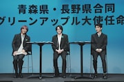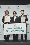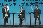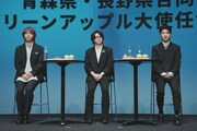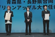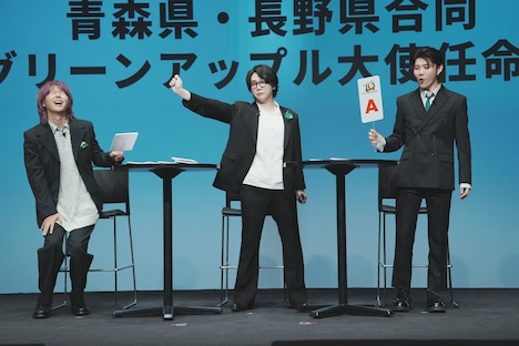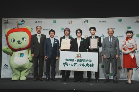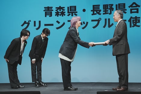 その後、青森県知事の宮下宗一郎氏と長野県知事の阿部守一氏から任命状を受け取ったMrs. GREEN APPLE。司会者に「青りんごのようにフレッシュな気持ちで挑んだことや、青りんごとの共通点は?」と尋ねられると、大森は「バンドという枠だけじゃなくて、いろんなことにチャレンジしていくのがMrs. GREEN APPLEというバンド。僕自身、今年は俳優業をやらせていただいたり、さまざまな現場でフレッシュな気持ちを感じさせていただいている。そのスタンスは非常に“グリーンアップル”だなと思います」と話す。若井は「見ての通り、青りんごのようにフレッシュな3人です。そこは青りんごとの共通点かなと思います。僕らの楽曲も青りんごのようにさまざまな味があるので、ぜひ幅広く味わっていただけたらうれしいです」とアピール。藤澤は「共通点として、“可能性”というものがあるのかなと思います。音楽のみならず、いろんなプローチや挑戦をして、そこでファンの方々との出会いがあって。青りんごもさらにいろんな方々にもっと知っていただいたら、たくさんの出会いがあるのではないかなと思います」と青りんごの可能性に希望を膨らませた。