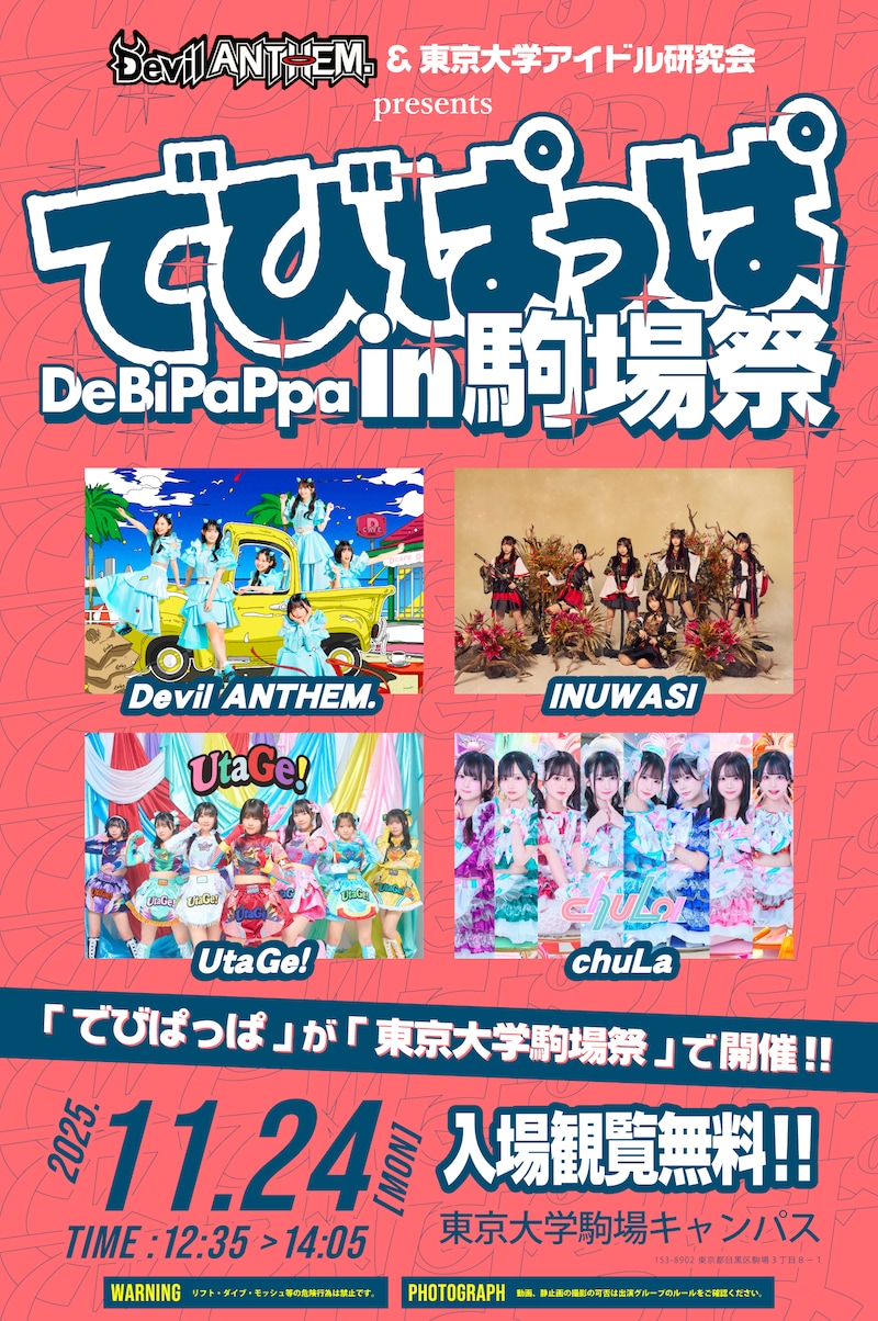 「でびぱっぱ」は、デビアンがゲストアイドルを迎えて定期的に開催しているライブ企画。今回は東京大学アイドル研究会とタッグを組む形で、東京大学の学園祭・駒場祭にて「でびぱっぱ in 駒場祭」として行われる。当日はデビアンのほか、