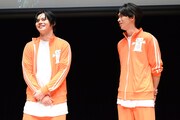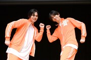 客席を縦半分に分け、「海チーム」と「稜雅チーム」でバトルを繰り広げた「客席はんぶんこ!チーム対抗 海vs稜雅」に進むと、会場の一体感はさらに上昇。ファンがどんなお題でジェスチャーしているかを稜海の2人が当てる「みんなのジェスチャー当て対決」では「天使」というお題になかなかたどり着けなかった海チームに対して、「呼び込み君」というお題を引いた稜雅チームのファンがジャージの左胸の呼び込み君を指すファインプレーで6秒53という好記録を導き出し、稜雅は勝利の“呼び込み君”ポーズで喜びをあらわにした。