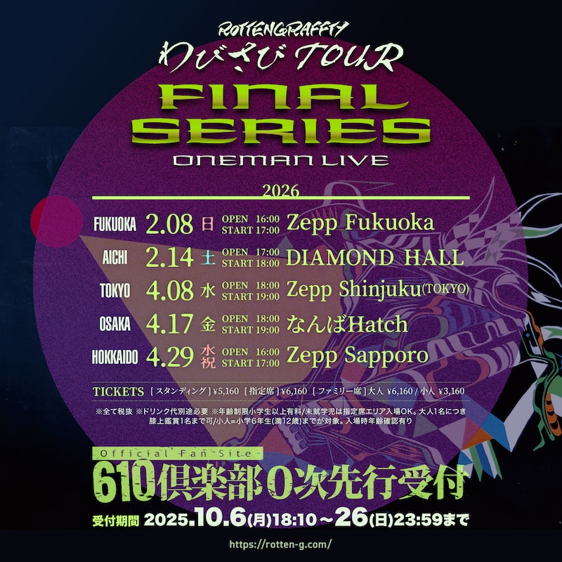 新たに発表された「わびさびTOUR FINAL SERIES ONEMAN LIVE」は、来年2月8日の福岡・Zepp Fukuokaを皮切りに全5公演が予定されている。オフィシャルファンクラブ・610倶楽部では、本日チケットの先行予約がスタートした。