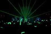 RAM RIDERは、特殊素材を使用し暗闇の中で光のラインだけが浮かび上がるおなじみの衣装で、バンドメンバーとともにステージに登場。鮮やかなレーザービームがフロアを彩る中、1曲目「GALAXY」からライブをスタートさせた。その後も「ファストラブ」「GOOD BYE」「アイデンティティ」「催眠」など、ニューアルバム収録のナンバーを惜しみなく披露していく。